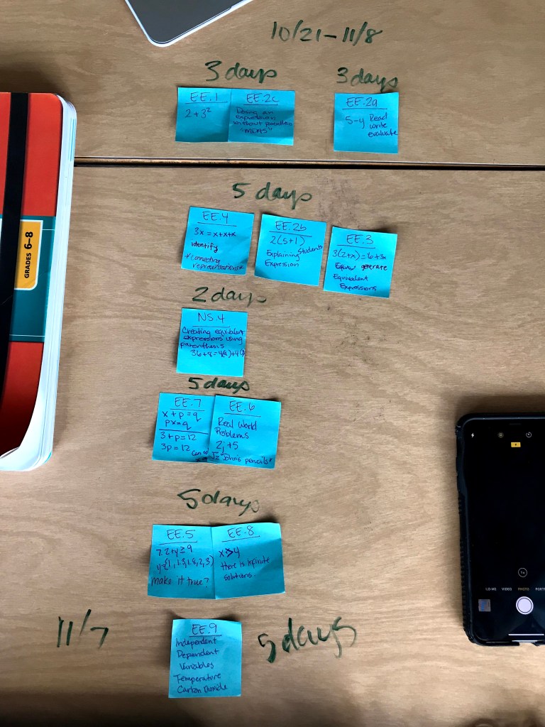 - We’re now ready to discuss pacing! Considering the students being taught, decide about how long each group of Post-It Notes might take to teach. You may have a group of 3 standards that will take 6 days, or a single standard that will take a month. Do this for all groupings. You’ve now paced your unit!